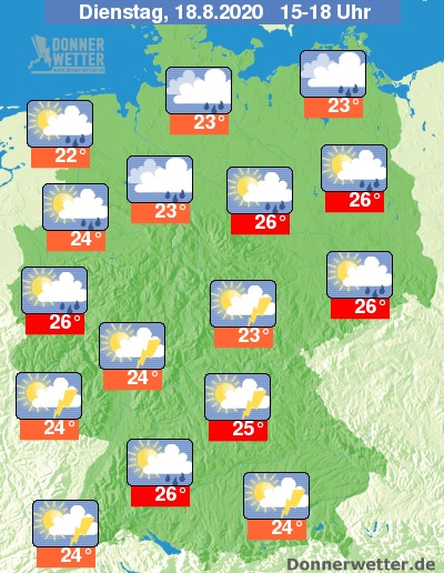 Am frühen Nachmittag werden mit sonniger Einstrahlung wieder mächtigere Haufenwolken produziert, die sich in Form von Regengüssen und Gewitter entladen. Dabei drohen auch wieder Starkregen, Hagelschlag, sowie kleinräumige Überflutungen. Regional bleibt es aber auch trocken.