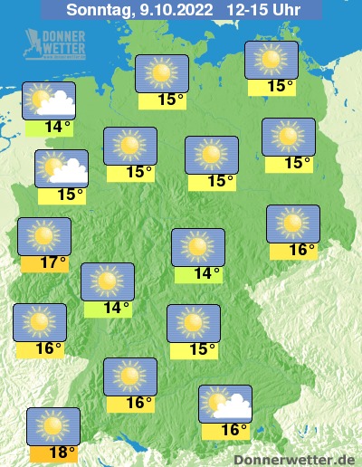 Heute Abend ziehen weiterhin nur vereinzelt wenige Wolken durch und der Sonnenuntergang geht meist wolkenlos vonstatten. Die Temperatur liegt bei 15 Grad in Erfurt und 18 Grad in Freiburg.
