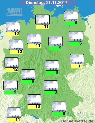 Am Dienstag ist es weitgehend dicht bewölkt und es fällt verbreitet Regen, regional auch kräftig oder langanhaltend. Die Temperatur steigt auf 6 Grad an der Müritz und bis 12 Grad entlang des Niederrheins.