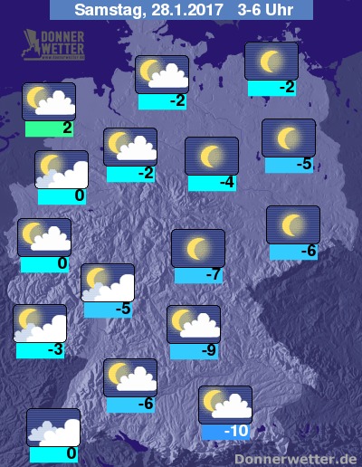In der folgenden Nacht bleibt es von Sachsen, über Brandenburg bis nach Mecklenburg-Vorpommern bei einem sternenklarem Himmel. Im übrigen Bundesgebiet ist es teils locker, teils aufgelockert bewölkt. Im Westen und Südwesten auch gebietsweise stark bewölkt. Es bleibt bundesweit trocken bei Werten von 2 Grad an der Nordsee und bis -9 Grad in Mittelfranken.