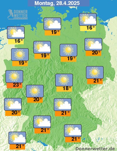 Heute können sich an den Alpen, neben heiteren Abschnitten, auch lokal Schauer und Gewitter entwickeln. An den Küsten sind einige Wolken möglich, wobei es hier trocken bleibt. Im übrigen Land ist es hingegen meist sonnig und dazu trocken. Die Höchstwerte liegen bei 16 Grad an den Küsten und bis zu 23 Grad im Raum Köln.