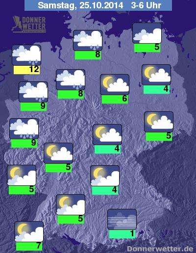 Der Samstag wird insgesamt ein unbeständiger Herbsttag, es ziehen immer wieder dichte Wolken mit gelegentlichem Regen durch, dabei sind aber auch Auflockerungen möglich. Freundlicher und weitgehend trocken ist es zunächst noch im Osten und Süden des Landes, aber auch hier kann es am Nachmittag gebietsweise regnen. Die Temperatur steigt auf 9 Grad am Stettiner Haff und bis 16 Grad in München.