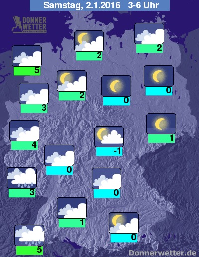 In der folgenden Nacht bleibt es im Osten meist sternenklar, im Nordosten, Südosten und auch in der Landesmitte ziehen meist einige, teils auch dichte Wolken auf, es bleibt jedoch weitgehend trocken. Über der Südwesthälfte bleibt die Wolkendecke meist geschlossen. In der zweiten Nachthälfte zieht im Südwesten Regen auf, der sich bis Sonnenaufgang etwa zu einer Linie vom westlichen NRW bis zum Bodensee hin ausbreitet. Die Temperatur sinkt auf 5 Grad in Freiburg und etwa -1 Grad im Thüringer Becken. An der Nordsee weht starker bis stürmischer, an der Ostsee teils starker Wind,