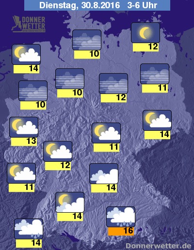 In der Nacht zum Dienstag halten sich über dem Süden Deutschlands meist dichte Wolken und am Alpenrand fällt zeitweise Regen, sonst ist es weitgehend trocken. Im übrigen Bundesgebiet ist der Himmel dagegen meist nur locker bewölkt und vor allem im Norden auch meist sternenklar, dazu bleibt es trocken. Die Temperatur sinkt auf 16 Grad in München und bis 10 Grad am Niederrhein.