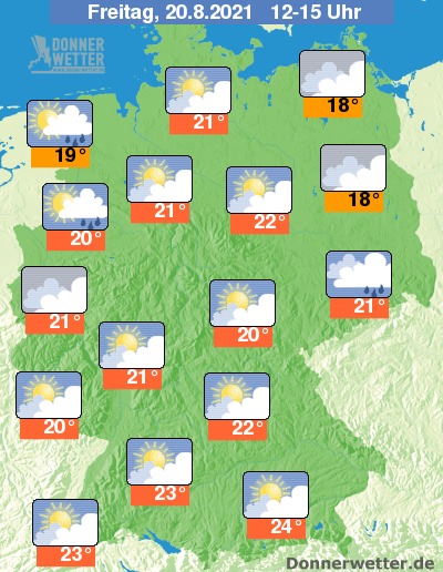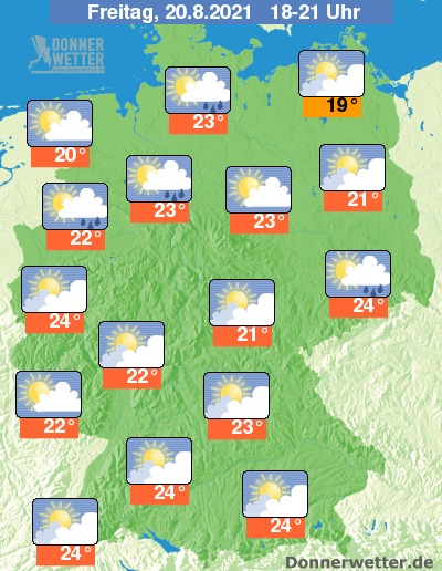 Heute Abend klingen letzte vereinzelte Schauer auch im Norden und Osten ab, dann ist es verbreitet heiter und es ziehen kaum noch dichtere Wolken durch. Die Temperatur liegt bei 19 Grad in Rostock und bis 24 Grad in München.