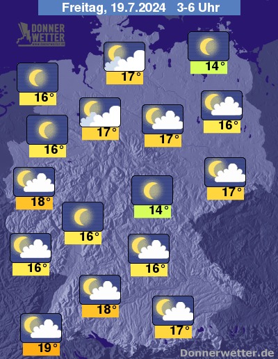 In der Nacht zum Freitag ist der Himmel locker bewölkt oder sogar sternenklar. Hier und da sind auch mal einige Wolken möglich, dazu bleibt es trocken. Die Temperatur sinkt auf 19 Grad im Breisgau und bis 14 Grad in Vorpommern.