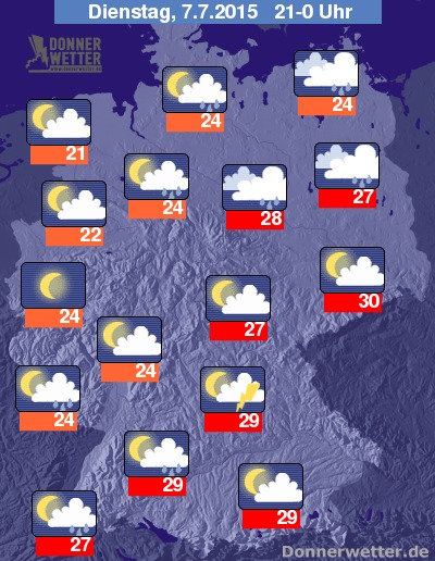 Heute Abend lockert der Himmel in den westlichen Landesteilen meist wieder auf und es bleibt dann weitgehend trocken. Im übrigen Bundesgebiet muss jedoch mit verbreitet kräftigen Schauer und teils schweren Gewittern mit Unwetterpotenzial gerechnet werden. Aktuelle Warnmeldungen des Deutschen Wetterdienstes erhalten Sie auf www.unwetter.de! Die Abendwerte liegen bei heißen 30 Grad in Dresden und um 21 Grad an der Nordsee.