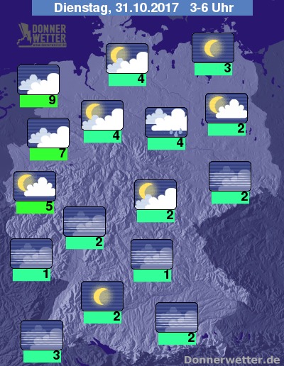 In der Nacht zum Dienstag ist es im Norden zum Teil locker bewölkt oder klar, oft ziehen hier aber auch dichte Wolken durch, dabei fällt aber nur selten etwas Regen. Weiter nach Süden hin zeigt sich der Himmel zunehmend sternenklar, dazu bleibt es trocken. Stellenweise bildet sich Nebel oder Hochnebel. Die Temperatur sinkt auf 9 Grad in Emden und bis 1 Grad in Mittelfranken.