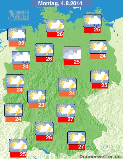 Am morgigen Montag bleibt uns das wechselhafte Sommerwetter noch erhalten, vor allem im Süden kann sich aber auch häufig die Sonne zeigen, besonders dicht bleiben die Wolken im Nordosten des Landes. Es können sich fast überall zeitweise Schauer und Gewitter entwickeln, weitgehend trocken bleibt es im Ostseeumfeld. Die Höchstwerte erreichen vielfach schwülwarme Werte zwischen 22 Grad an der Nordseeküste und 27 Grad in München.