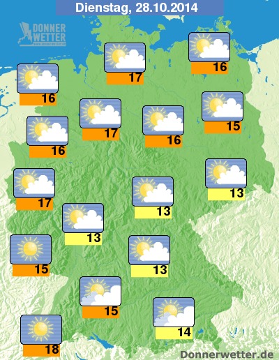 Am Dienstag setzt sich das ruhige, trockene und verbreitet auch freundliche Herbstwetter fort. Es ziehen meist nur lockere Wolkenfelder durch. Bei Temperaturen zwischen 13 und 18 Grad wird es auch zeitweise sonnig.