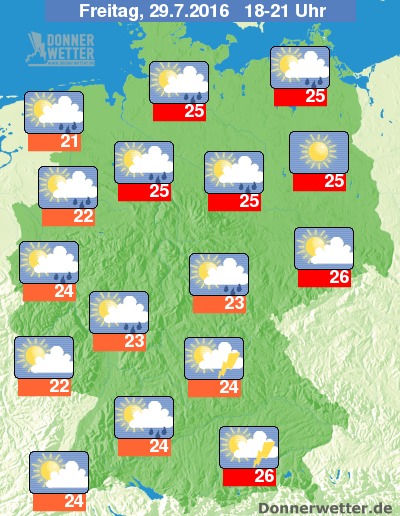Heute Abend zeigt sich das Wetter weiterhin verbreitet wechselhaft mit einem Mix aus heiteren Abschnitten und mal mehr mal weniger vielen und oft auch dichten Wolken, dabei bilden sich gebietsweise Schauer, vor allem im Süden bilden sich auch örtliche Gewitter. Die Temperatur liegt bei 21 Grad in Wilhelmshaven und um 26 Grad in Dresden.