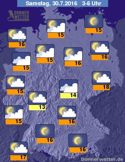 In der Nacht zum Samstag sind anfangs vor allem im Osten und Süden vereinzelt Schauer oder Gewitter möglich, sonst zeigt sich der Himmel über dem Land aber meist nur locker oder aufgelockert bewölkt, im Süden und Nordosten auch verbreitet sternenklar und weitgehend trocken. An der Nordsee bilden sich hier und da einzelne Schauer. Die Temperatur sinkt auf 18 Grad in Hoyerswerda und etwa 13 Grad am Hunsrück.