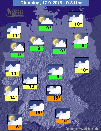 In der Nacht auf Dienstag zeigt sich der Himmel über weiten Teilen des Landes wechselnd oder stark bewölkt, in der Nord- und Osthälfte dominieren zeitweise auch lockere Wolken. In Franken und dem Bayerischen Wald sowie an der Ostseeküste können zeitweise einzelne Schauer fallen, sonst bleibt es meist trocken.