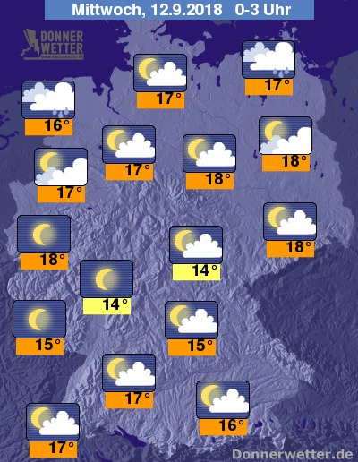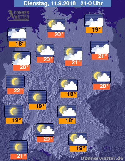Die Temperaturen sinken im Nachtverlauf auf Werte um 18 Grad C in Berlin und um 14 Grad C im Thüringer Wald.
