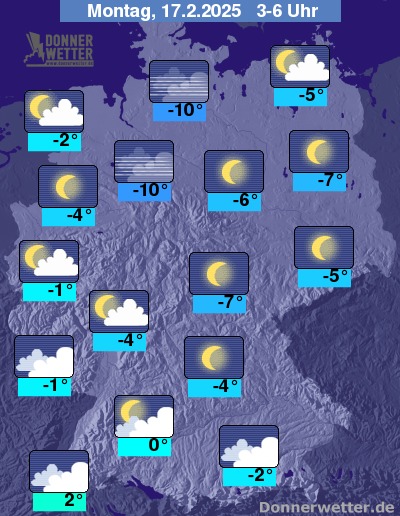 In der Nacht zum Montag bleibt der Himmel über den Alpen wolkig oder es ist stark bewölkt. Sonst zeigt sich der Himmel sternenklar oder nur gering bewölkt; in den frühen Morgenstunden nimmt die Bewölkung im Westen und Südwesten zu. Es bleibt trocken.