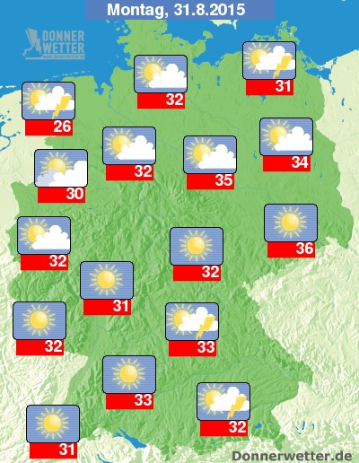 Am Montag ziehen besonders in den küstennahen Regionen von Norddeutschland oft dichte Wolken durch und es können sich hier zeitweise Schauer und Gewitter entwickeln. Sonst ist es im Norden heiter oder wechselnd bewölkt, aber weitgehend trocken. Von der breiten Mitte bis nach Süddeutschland zeigt sich der Himmel verbreitet sonnig oder nur leicht bewölkt. Im Tagesverlauf zeigen sich jedoch gebietsweise auch dichter werdende Quellwolken und vor allem in den westlichsten Landesteilen, aber auch sonst steigt das Schauer- und Gewitterrisiko etwas an, größtenteils bleibt es jedoch trocken. Die Temperatur steigt auf 26 Grad an der Nordsee und auf drückend heiße 36 Grad in Dresden.