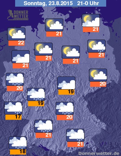 In der ersten Nachthälfte regnet es im Süden und Westen verbreitet. In der Nordhälfte des Landes bleibt es bei lockerer Bewölkung meist trocken. Die Temperaturen sinken auf Werte um 22 Grad C im Nordwesten und um 17 Grad C im Saarland.