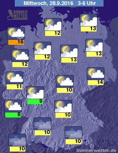 Die Temperaturen erreichen am Morgen Werte um 9 Grad C in Oberbayern und um 16 Grad C an der Nordseeküste.