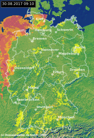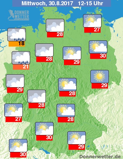 Heute Abend nimmt auch die Bewölkung über der Osthälfte des Landes insgesamt zu, überwiegend bleibt es hier aber noch aufgelockert und nur teils auch stark bewölkt, dabei jedoch weitgehend trocken. In den westlicheren Landesteilen zieht auch oft starke, sonst aufgelockerte Bewölkung durch, hier sind vielerorts Schauer und auch örtliche Gewitter zu erwarten. Die Temperatur liegt bei 18 Grad in Emden und bis 31 Grad in Stuttgart.