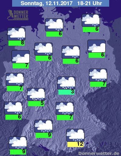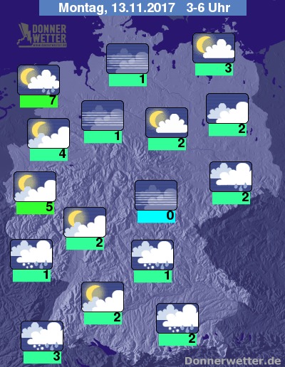 In der Nacht zum Montag fällt vor allem im Süden, aber auch im Osten gebietsweise Regen, Schneeregen oder Schnee, sonst ist es oft locker bis aufgelockert und zumeist trocken. Im Nordseeumfeld ist es oft stark bewölkt und es bilden sich hier einzelne Schauer. Die Temperatur sinkt auf 7 Grad in Wilhelmshaven und bis 0 Grad im Thüringer Becken. Es besteht zum Teil Straßenglätte durch Schnee oder überfrierende Nässe!