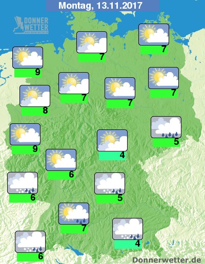 Am Montag halten sich über Sachsen und dem Süden der Republik meist dichte Wolken aus denen gebietsweise Regen, Schneeregen oder Schnee fällt. Im großen Rest der Bundesrepublik kann sich wiederholt die Sonne zeigen und es ziehen überwiegend nur lockere Wolkenfelder durch, dabei bleibt es von einzelnen Ausnahmen abgesehen auch trocken. Die Temperatur steigt auf 4 bis 9 Grad. Es besteht zum Teil Straßenglätte durch Schnee oder überfrierende Nässe!