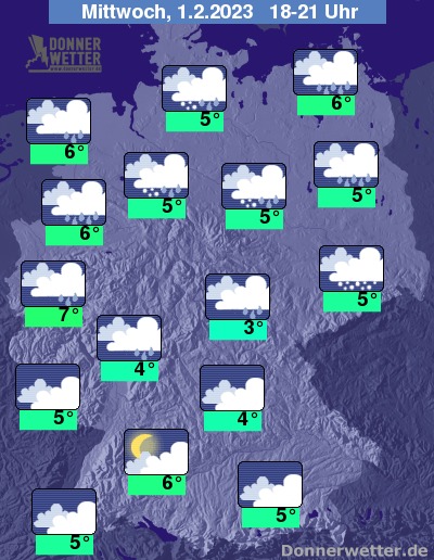 Heute Nachmittag zieht weitgehend dichte Bewölkung durch, dabei fällt hier und da etwas Regen, Schneeregen, im Süden und Osten teils Schnee. Häufig bleibt es auch trocken bei Werten von 3 Grad im Vogtland und 6 Grad im Rheinland. Es weht ein starker und teils stürmischer Wind. An der Nordsee herrscht oft schwerer Sturm.