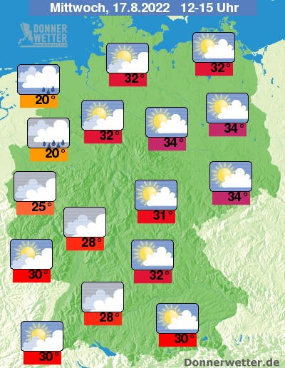 Heute Nachmittag bleibt es über der Osthälfte des Landes heiter bis sonnig und trocken. Weiter nach Westen hin ziehen hingegen oft viele und teils kompakte Wolken auf, dabei sind entlang von Niederrhein und Ems erste Schauer, selten auch Gewitter möglich. Sonst bleibt es noch weitgehend trocken bei 20 Grad an der Ems und bis 34 Grad an der Oder.