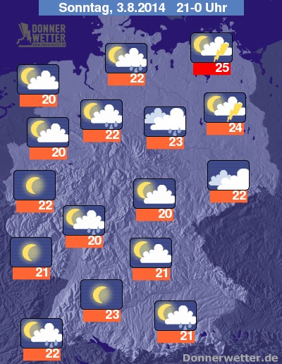 Auch am Abend bilden sich noch verbreitet Schauer und Gewitter, die Intensität nimmt aber im Allgemeinen etwas ab. Vor allem von Westen und Südwesten her kann der Himmel auch häufig aufklaren. Die abendlichen Temperaturen bewegen sich zwischen 25 Grad an der Müritz und 20 Grad an der Ems.