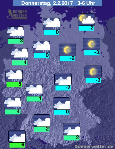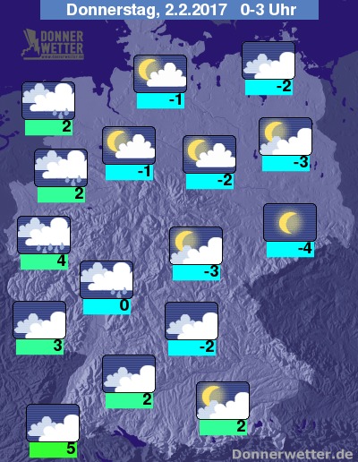 In dem Gebiet zwischen Hamburg und dem Saarland müssen wir in der Nacht mit Regen rechnen. Im Nosten ist der Himmel in der zweiten Nachthälfte überwiegend klar bis leicht bewölkt. Im Süden hingegend ebenfalls dichte Wolken, jedoch bleibt es hier überwiegend trocken.