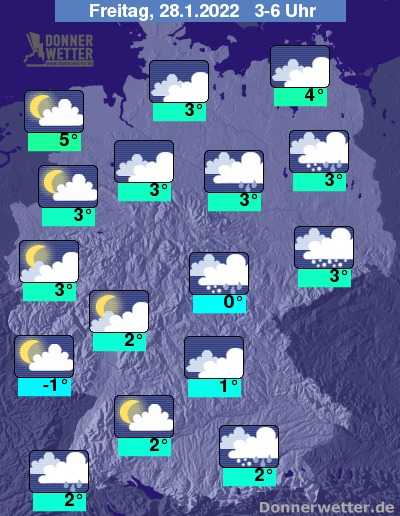 In der Nacht zum Freitag zieht in den westlichen Landesteilen teils lockere, oft jedoch starke Bewölkung durch, dabei bleibt es weitgehend trocken. Im übrigen Bundesgebiet ziehen größtenteils dichte Wolken durch und es fällt gebietsweise Regen, Schneeregen oder Schnee. Die Temperatur sinkt auf 5 Grad an der Nordsee und bis -1 Grad am Pfälzer Wald. Der Wind weht im Norden und Osten weiterhin stark bis stürmisch. An den Küsten herrscht meist Sturm.