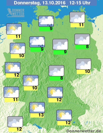 Schauer gibt es am Nachmittag nur noch zwischen Bremen und Hamburg. Sonst bestimmen meist dichte Wolken das Wettergeschehen. Im Süden und Westen gibt es jedoch auch zahlreiche Aufhellungen und sonnige Abschnitte. Die Höchstwerte liegen zwischen 8 Grad im Thüringer Bergland und 13 Grad in Schwaben.