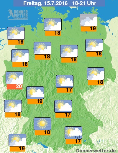 Heute Abend ist es im Ostseeumfeld oft stark bewölkt, jedoch trocken, am Alpenrand sind bei teils dichten Wolken noch einzelne Schauer möglich. Sonst ist es im Süden aber auch oft heiter bis sonnig und dazu trocken. Im übrigen Land ist es wechselnd bis aufgelockert bewölkt und ebenfalls trocken. Die Temperatur liegt bei 17 Grad im Vogtland und etwa 20 Grad in Düsseldorf.