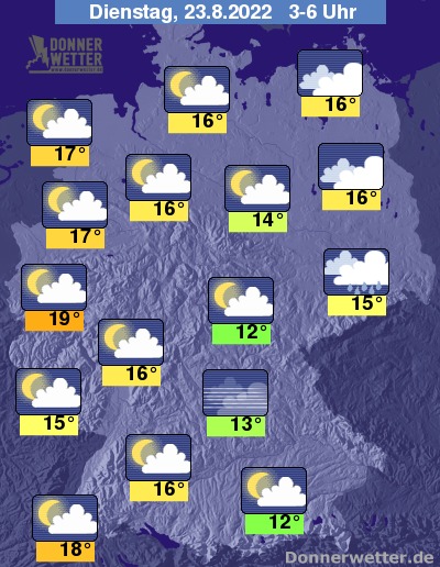 In der Nacht zum Dienstag ist der Himmel über den östlichen Landesteilen verbreitet dicht bewölkt, über dem Osten von Brandenburg und Sachsen fällt dazu teils Regen. Im übrigen Land ist es zum Großteil locker bewölkt und dabei trocken. Die Temperatur sinkt auf 19 Grad in Köln und bis 12 Grad in Augsburg.