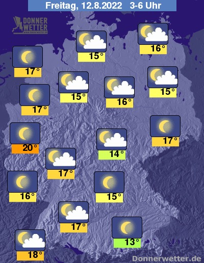 In der Nacht zum Freitag können gebietsweise lockere Wolkenfelder durchziehen, häufig ist es auch sternenklar. Es bleibt landesweit trocken bei tropischen 20 Grad in Köln und kühleren 13 Grad im Raum München.
