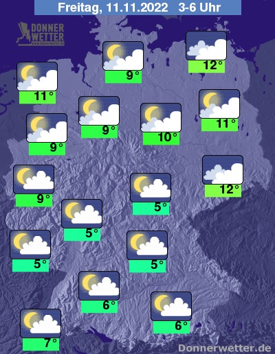 In der folgenden Nacht bleibt es über dem Norden und Osten Deutschlands teils aufgelockert, oft jedoch stark bewölkt. Im übrigen Land ist der Himmel jedoch mehrheitlich nur locker bewölkt, teils ziehen auch einige Wolken durch. Es bleibt bundesweit trocken bei Tiefstwerten von 12 Grad in Neubrandenburg und etwa 5 Grad in Nürnberg.