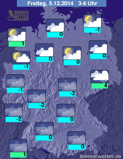 Heute Abend ziehen in der Nordhälfte des Landes meist dichte Wolken durch, dabei kann vor allem in der Norddeutschen Tiefebene zeitweise etwas Regen fallen, sonst bleibt es weitgehend trocken. Weiter nach Süden hin ist es häufig stark bewölkt oder neblig trüb, gebietsweise ist es aber auch aufgelockert bewölkt, im äußeren Süden und Südwesten auch teils klar, dabei bleibt es trocken. Die Abendtemperatur liegt bei 4 Grad in Dresden und um -1 Grad im Saargau.