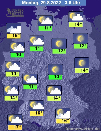 In der Nacht zum Montag zeigt sich der Himmel über Deutschland meist sternenklar oder nur locker bewölkt. Im Lauf der Nacht zieht es sich jedoch im Nordwesten und Norden immer weiter zu und gegen Morgen sind an den Küsten Schauer möglich. Im übrigen Land bleibt es trocken bei Tiefstwerten von 17 Grad in Freiburg und etwa 10 Grad in Jena.