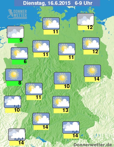 Die Temperaturen liegen am Morgen bei Werten um 6 Grad C im Münsterland und um 14 Grad C in Oberbayern.