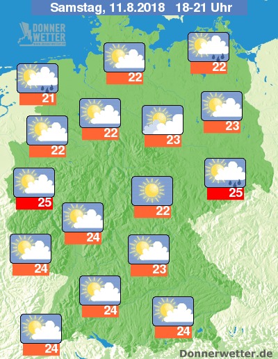 Heute Abend bilden sich am Erzgebirge und im Umfeld von Nord- und Ostsee noch einzelne Schauer und vereinzelt auch Gewitter, sonst herrscht aber verbreitet heiteres und trockenes Wetter. Die Temperatur liegt bei 21 Grad in Cuxhaven und bis 25 Grad in Bonn.