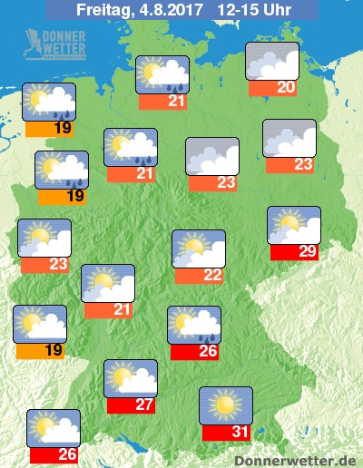 Bis zum Abend reißt die Wolkendecke auch im Norden auf und bis zum Sonnenuntergang kommen noch einige Sonnenstunden zusammen. An den Alpen bilden sich allerdings in schwül-heißer Luft Quellwolken und es kommt lokal zu Schauern und Gewittern.