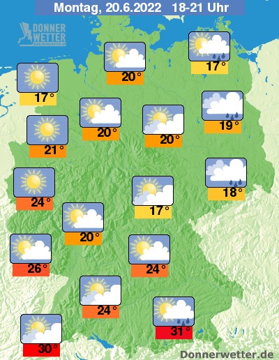 Heute Abend sind lediglich an den Alpen und in den östlichsten Landesteilen noch einzelne Schauer und seltene Gewitter möglich. Im großen Rest der Republik ist es nur locker bewölkt und zunehmend auch sonnig, dazu bleibt es trocken, Die Temperatur liegt bei 17 Grad in Rostock und bis 31 Grad in München.