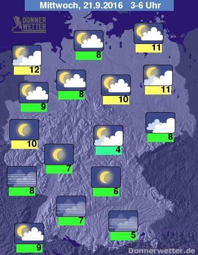 Die Temperaturen sinken im Nachtverlauf auf Werte um 12 Grad C in Ostfriesland und um 4 Grad C im Thüringer Wald.