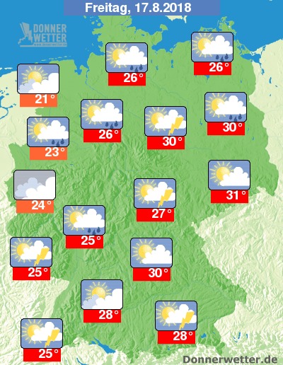 Eine Störungsfront überquert Deutschland von West nach Ost und löst gebietsweise Schauer und Gewitter aus. Diese Regengüsse werden zwar nicht jeden treffen, können dafür aber örtlich wieder recht kräftig und in Begleitung von Platzregen und Hagel ausfallen. Teile Ostdeutschlands und Bayerns bleiben davon aber noch weitgehend verschont. Vor den Gewittern wird es im Osten und Süden mit 27 bis 33 Grad wieder sehr warm bis heiß. Auf der Rückseite dieser Störung werden bei einer Mischung aus mehr Wolken als Sonne angenehmere 21 bis 27 Grad erreicht. Der Wind weht meist nur schwach bis mäßig, kann jedoch bei Schauern und Gewittern auch böig auffrischen. Hinter der Front dreht er auf Nordwest bis Nord.