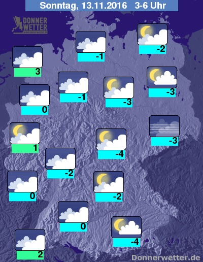 In der Nacht zum Sonntag ist es zunächst noch überwiegend locker oder aufgelockert bewölkt, nach Osten und Nordosten hin auch verbreitet sternenklar. Im Laufe der Nacht zieht sich der Himmel über der Westhälfte mehr und mehr zu, jedoch bleibt es im ganzen Land trocken. Die Temperatur sinkt auf 3 Grad an der Nordsee und bis -4 Grad im Thüringer Becken.