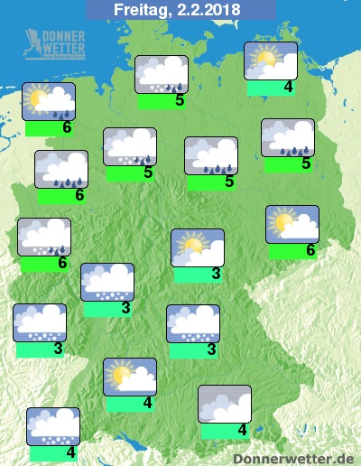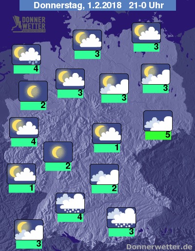 In der ersten Nachthälfte bleibt es verbreitet trocken. Lediglich im Süden fällt Niederschlag, der vor allem am Alpenrand und im Allgäu in Form von Schnee fällt. Insbesondere entlang des Niederrhein ist es hingegen meist sternenklar. Die Tiefsttemperaturen liegen am frühen Freitag Morgen meist knapp über dem Gefrierpunkt.