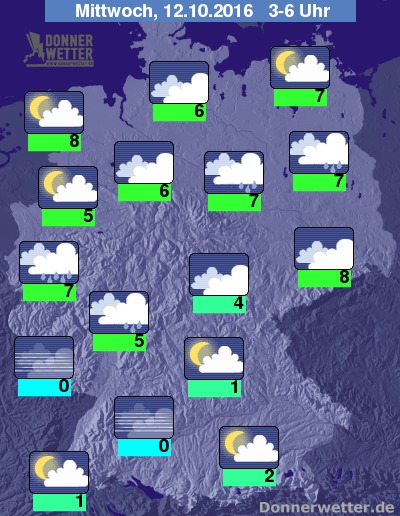 In der kommenden Nacht bleibt es im Süden und Südwesten weitgehend locker bewölkt oder sternenklar, dabei kann sich hier stellenweise Nebel oder Hochnebel bilden, dazu besteht die Gefahr von Rauhreif oder überfrierender Nässe! Im übrigen Bundesgebiet halten sich meist dichte Wolken und gebietsweise fällt Regen. Auflockerungen sind vor allem im Nordosten und Nordwesten möglich. Die Temperatur sinkt auf 8 bis 0 Grad.