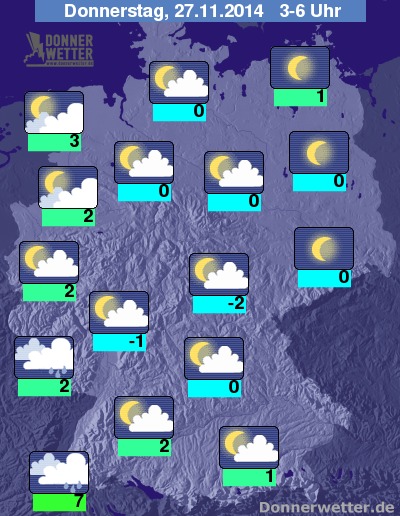 In der Nacht zum Donnerstag ziehen im Westen und Südwesten der Republik oft dichte Wolken durch, die für regional etwas Regen sorgen können. In den anderen Landesteilen bleibt es dagegen bei überwiegend lockerer bis aufgelockerter Bewölkung trocken, nach Osten und Nordosten hin zeigt sich der Himmel häufig sternenklar. Die Temperatur sinkt auf noch recht milde 7 Grad in Freiburg und auf etwa -2 Grad im Thüringer Becken.