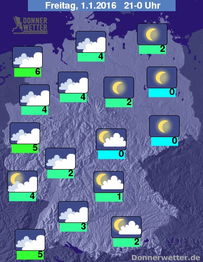 In der Nacht zum Samstag bleibt es im Osten meist sternenklar, im Nordosten, Südosten und auch in der Landesmitte ziehen meist einige, teils auch dichte Wolken auf, es bleibt jedoch weitgehend trocken. Über der Südwesthälfte bleibt die Wolkendecke meist geschlossen. In der zweiten Nachthälfte zieht im Südwesten Regen auf, der sich bis Sonnenaufgang bis etwa zu einer Linie vom westlichen NRW bis zum Bodensee hin ausbreitet. Die Temperatur sinkt auf 5 Grad in Freiburg und etwa -1 Grad im Thüringer Becken. An der Nordsee weht starker bis stürmischer, an der Ostsee teils starker Wind,