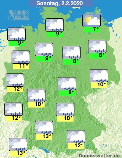 Am Sonntag ziehen überwiegend dichte Wolken übers Land hinweg, dabei fällt über der Südwesthälfte des Landes häufig Regen, während es sonst zumeist trocken bleibt. Die Temperatur steigt auf 7 Grad in Stralsund und bis 13 Grad in Karlsruhe. An der Ostsee herrscht zum Teil Sturm.