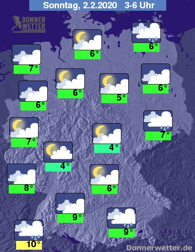 In der Nacht zum Sonntag lockert die Bewölkung hin und wieder auf, gebietsweise bringen dichte Wolken aber auch Regen. Die Temperatur sinkt auf 10 Grad im Oberrheingraben und bis 4 Grad im Vogtland. Vor allem über der Nordhälfte des Landes weht ein teils starker bis stürmischer Wind, an den Küsten herrscht häufig auch Sturm.